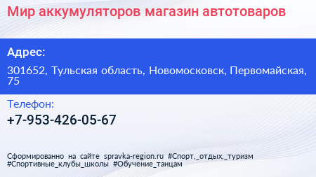 Мир аккумуляторов, магазин автотоваров по адресу 301652, Тульская область, Новомосковск, Первомайская, 75 в дальнейшем Организация, размещена в следующих категориях: