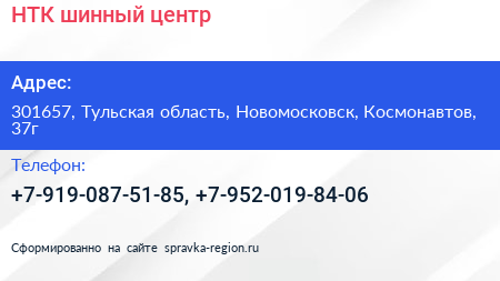 НТК, шинный центр по адресу 301657, Тульская область, Новомосковск, Космонавтов, 37г в дальнейшем Организация, размещена в следующих категориях: