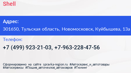 Shell по адресу 301650, Тульская область, Новомосковск, Куйбышева, 13а в дальнейшем Организация, размещена в следующих категориях: