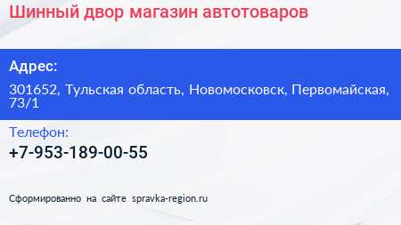 Шинный двор, магазин автотоваров по адресу 301652, Тульская область, Новомосковск, Первомайская, 73/1 в дальнейшем Организация, размещена в следующих категориях: