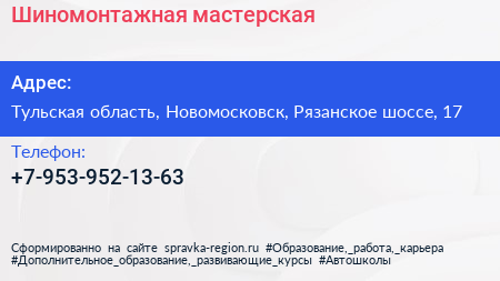 Шиномонтажная мастерская по адресу Тульская область, Новомосковск, Рязанское шоссе, 17 в дальнейшем Организация, размещена в следующих категориях: