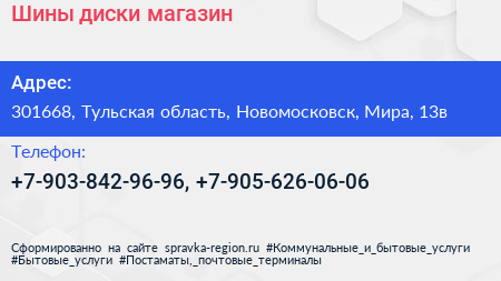 Шины диски, магазин по адресу 301668, Тульская область, Новомосковск, Мира, 13в в дальнейшем Организация, размещена в следующих категориях: