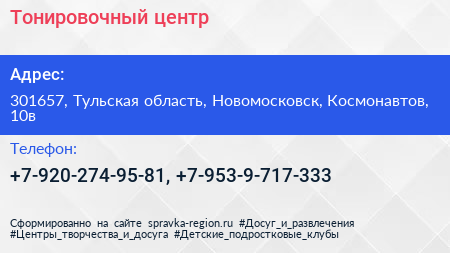Тонировочный центр по адресу 301657, Тульская область, Новомосковск, Космонавтов, 10в в дальнейшем Организация, размещена в следующих категориях: