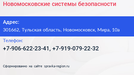 Новомосковские системы безопасности по адресу 301662, Тульская область, Новомосковск, Мира, 10а в дальнейшем Организация, размещена в следующих категориях: