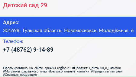 Детский сад №29 по адресу 301698, Тульская область, Новомосковск, Молодёжная, 6 в дальнейшем Организация, размещена в следующих категориях: