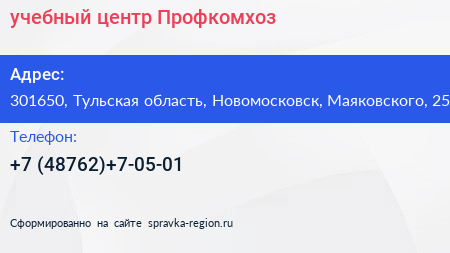 учебный центр Профкомхоз по адресу 301650, Тульская область, Новомосковск, Маяковского, 25 в дальнейшем Организация, размещена в следующих категориях: