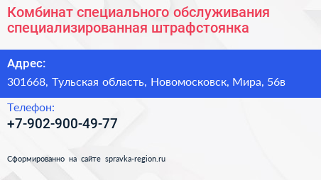 Комбинат специального обслуживания, специализированная штрафстоянка по адресу 301668, Тульская область, Новомосковск, Мира, 56в в дальнейшем Организация, размещена в следующих категориях: