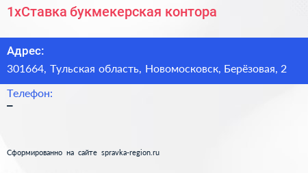 1xСтавка, букмекерская контора по адресу 301664, Тульская область, Новомосковск, Берёзовая, 2 в дальнейшем Организация, размещена в следующих категориях: