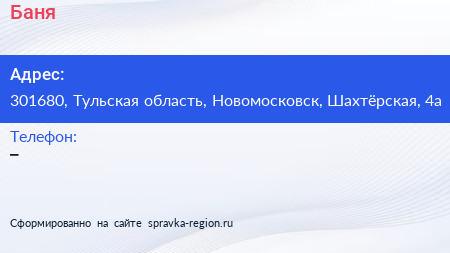 Баня по адресу 301680, Тульская область, Новомосковск, Шахтёрская, 4а в дальнейшем Организация, размещена в следующих категориях: