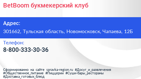 BetBoom, букмекерский клуб по адресу 301662, Тульская область, Новомосковск, Чапаева, 12Б в дальнейшем Организация, размещена в следующих категориях: