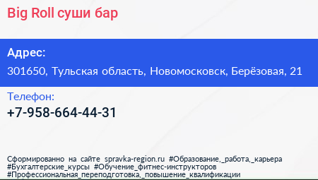 Big Roll, суши-бар по адресу 301650, Тульская область, Новомосковск, Берёзовая, 21 в дальнейшем Организация, размещена в следующих категориях: