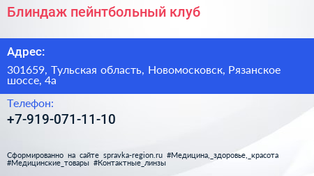 Блиндаж, пейнтбольный клуб по адресу 301659, Тульская область, Новомосковск, Рязанское шоссе, 4а в дальнейшем Организация, размещена в следующих категориях:
