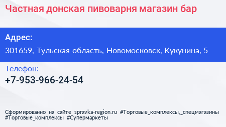 Частная донская пивоварня, магазин-бар по адресу 301659, Тульская область, Новомосковск, Кукунина, 5 в дальнейшем Организация, размещена в следующих категориях: