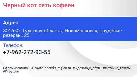 Черный кот, сеть кофеен по адресу 301650, Тульская область, Новомосковск, Трудовые резервы, 25 в дальнейшем Организация, размещена в следующих категориях: