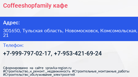 #Coffeeshopfamily, кафе по адресу 301650, Тульская область, Новомосковск, Комсомольская, 21 в дальнейшем Организация, размещена в следующих категориях: