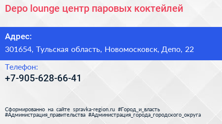 Depo lounge, центр паровых коктейлей по адресу 301654, Тульская область, Новомосковск, Депо, 22 в дальнейшем Организация, размещена в следующих категориях: