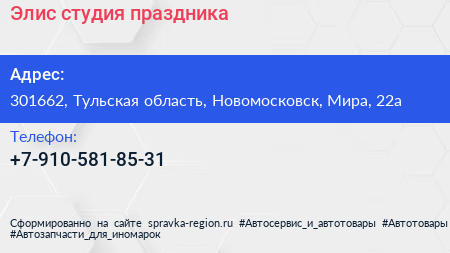 Элис, студия праздника по адресу 301662, Тульская область, Новомосковск, Мира, 22а в дальнейшем Организация, размещена в следующих категориях: