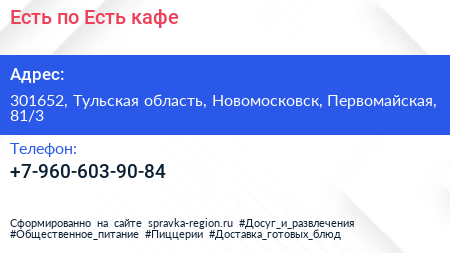 Есть по Есть, кафе по адресу 301652, Тульская область, Новомосковск, Первомайская, 81/3 в дальнейшем Организация, размещена в следующих категориях: