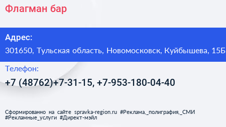Флагман, бар по адресу 301650, Тульская область, Новомосковск, Куйбышева, 15Б в дальнейшем Организация, размещена в следующих категориях: