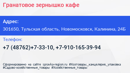 Гранатовое зернышко, кафе по адресу 301650, Тульская область, Новомосковск, Калинина, 24Б в дальнейшем Организация, размещена в следующих категориях: