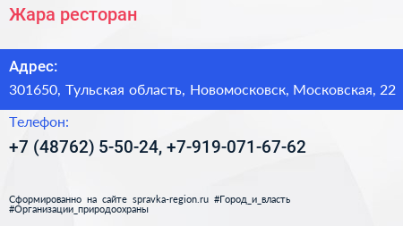 Жара, ресторан по адресу 301650, Тульская область, Новомосковск, Московская, 22 в дальнейшем Организация, размещена в следующих категориях: