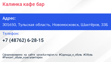 Калинка, кафе-бар по адресу 301650, Тульская область, Новомосковск, Шахтёров, 33Б в дальнейшем Организация, размещена в следующих категориях: