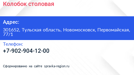 Колобок, столовая по адресу 301652, Тульская область, Новомосковск, Первомайская, 77/1 в дальнейшем Организация, размещена в следующих категориях: