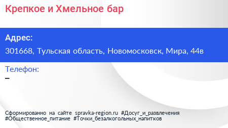 Крепкое и Хмельное, бар по адресу 301668, Тульская область, Новомосковск, Мира, 44в в дальнейшем Организация, размещена в следующих категориях: