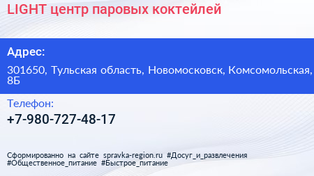 LIGHT, центр паровых коктейлей по адресу 301650, Тульская область, Новомосковск, Комсомольская, 8Б в дальнейшем Организация, размещена в следующих категориях:
