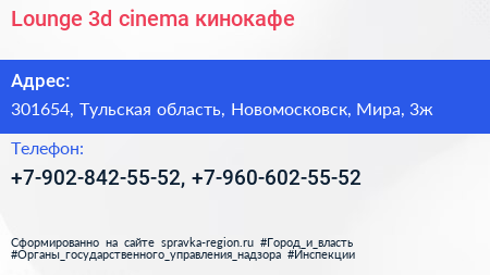 Lounge 3d cinema, кинокафе по адресу 301654, Тульская область, Новомосковск, Мира, 3ж в дальнейшем Организация, размещена в следующих категориях: