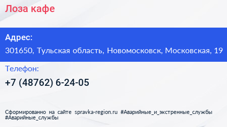 Лоза, кафе по адресу 301650, Тульская область, Новомосковск, Московская, 19 в дальнейшем Организация, размещена в следующих категориях: