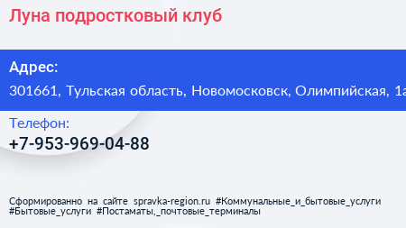 Луна, подростковый клуб по адресу 301661, Тульская область, Новомосковск, Олимпийская, 1а в дальнейшем Организация, размещена в следующих категориях: