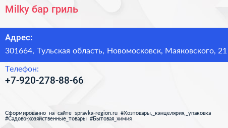 Milky, бар-гриль по адресу 301664, Тульская область, Новомосковск, Маяковского, 21 в дальнейшем Организация, размещена в следующих категориях:
