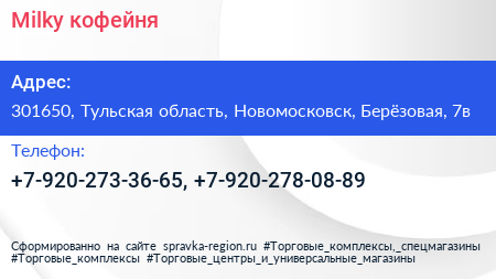 Milky, кофейня по адресу 301650, Тульская область, Новомосковск, Берёзовая, 7в в дальнейшем Организация, размещена в следующих категориях: