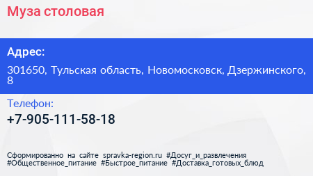 Муза, столовая по адресу 301650, Тульская область, Новомосковск, Дзержинского, 8 в дальнейшем Организация, размещена в следующих категориях: