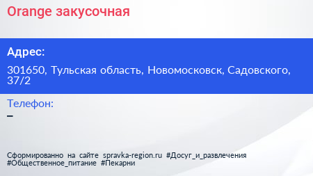 Orange, закусочная по адресу 301650, Тульская область, Новомосковск, Садовского, 37/2 в дальнейшем Организация, размещена в следующих категориях: