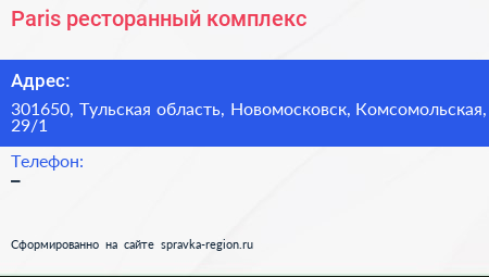 Paris, ресторанный комплекс по адресу 301650, Тульская область, Новомосковск, Комсомольская, 29/1 в дальнейшем Организация, размещена в следующих категориях: