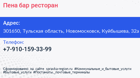 Пена, бар-ресторан по адресу 301650, Тульская область, Новомосковск, Куйбышева, 32а в дальнейшем Организация, размещена в следующих категориях: