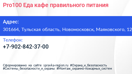 Pro100 Еда, кафе правильного питания по адресу 301664, Тульская область, Новомосковск, Маяковского, 12 в дальнейшем Организация, размещена в следующих категориях: