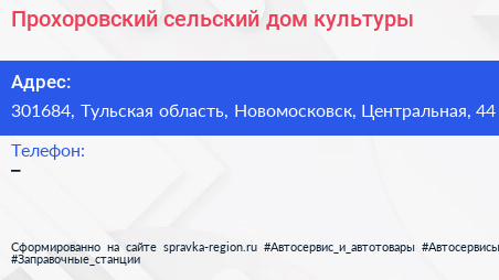 Прохоровский сельский дом культуры по адресу 301684, Тульская область, Новомосковск, Центральная, 44 в дальнейшем Организация, размещена в следующих категориях: