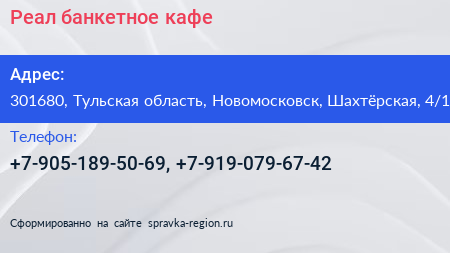 Реал, банкетное кафе по адресу 301680, Тульская область, Новомосковск, Шахтёрская, 4/1 в дальнейшем Организация, размещена в следующих категориях: