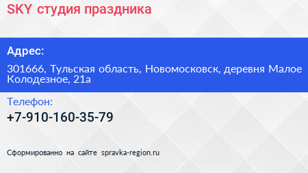 SKY, студия праздника по адресу 301666, Тульская область, Новомосковск, деревня Малое Колодезное, 21а в дальнейшем Организация, размещена в следующих категориях: