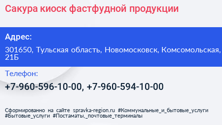 Сакура, киоск фастфудной продукции по адресу 301650, Тульская область, Новомосковск, Комсомольская, 21Б в дальнейшем Организация, размещена в следующих категориях: