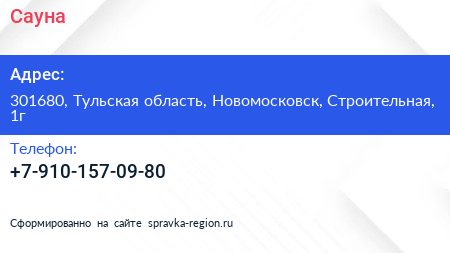 Сауна по адресу 301680, Тульская область, Новомосковск, Строительная, 1г в дальнейшем Организация, размещена в следующих категориях: