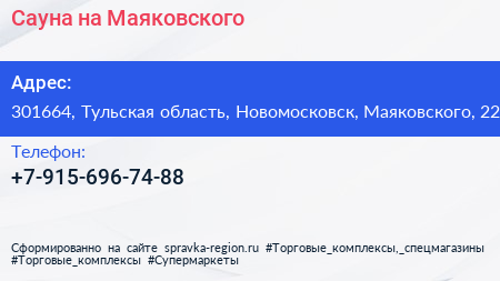 Сауна на Маяковского по адресу 301664, Тульская область, Новомосковск, Маяковского, 22 в дальнейшем Организация, размещена в следующих категориях:
