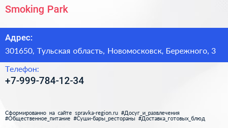 Smoking Park по адресу 301650, Тульская область, Новомосковск, Бережного, 3 в дальнейшем Организация, размещена в следующих категориях: