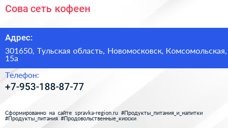 Сова, сеть кофеен по адресу 301650, Тульская область, Новомосковск, Комсомольская, 15а в дальнейшем Организация, размещена в следующих категориях:
