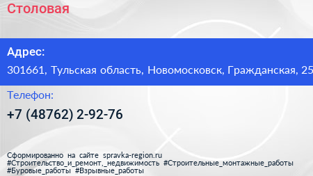 Столовая по адресу 301661, Тульская область, Новомосковск, Гражданская, 25 в дальнейшем Организация, размещена в следующих категориях: