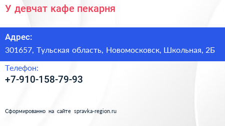У девчат, кафе-пекарня по адресу 301657, Тульская область, Новомосковск, Школьная, 2Б в дальнейшем Организация, размещена в следующих категориях: