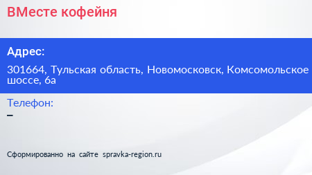 ВМесте, кофейня по адресу 301664, Тульская область, Новомосковск, Комсомольское шоссе, 6а в дальнейшем Организация, размещена в следующих категориях: